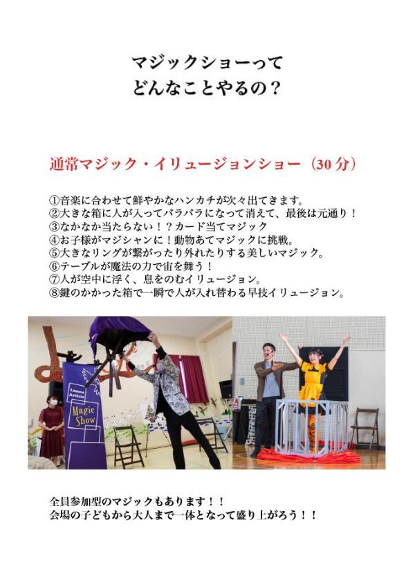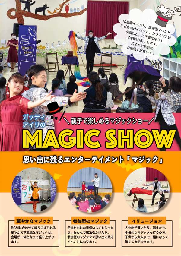 - マジックは子どもから大人まで一緒に楽しめるエンターテインメントです。TVの中でしか観た事のない不思議なマジックを実際に目の前でご体感ください!