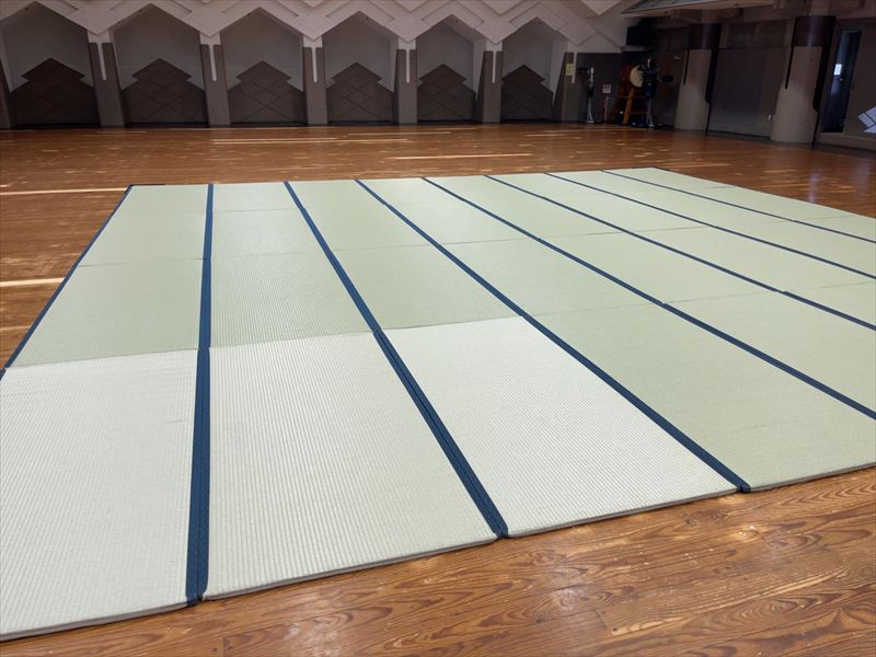 以前ダンスホールだった会場に畳を敷いてきました!約200畳になります!床面がフローリングになっておりましたが、畳止めやスチロール材などで固定していくのでズレる心配はありません!広く空いてしまったスペースには、はんぱ畳を使用して畳部分を多くとるようにしているんです!お客様の出入りが多い入口付近は、念入りに畳を固定することがポイントですね!200畳の圧巻な会場にお客様も喜んでおられましたよ!