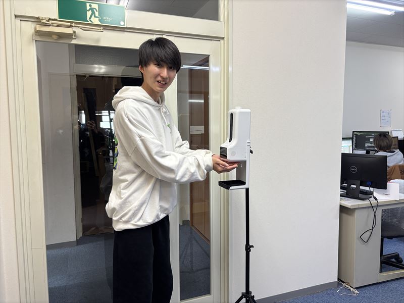 手をかざすと検温と消毒液の噴霧を自動でやってくれる機械です!