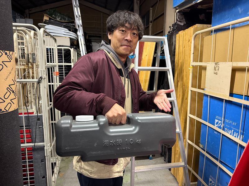イベント設営やテントの固定に欠かせない、定番の注水ウェイト💧 使うときに水を入れるタイプなので、空の状態はとっても軽くて持ち運びラクラク! 握りやすい取っ手付きで、現場での移動や設置もスムーズです❗ シンプルなデザインと落ち着いたチャコールグレーで、どんな会場でも目立ちすぎず、しっかり役割を果たしてくれます✨ 「縁の下の力持ち」として、現場をしっかり支えるアイテムです💪
