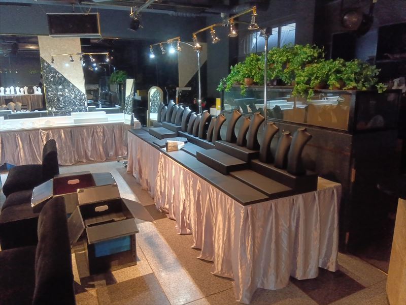 福島県の会津若松市にある施設内で宝石展示会場の設営をさせていただきました! 会場は2階の貸会議室で普段は施設の方が会議を行ったり、今回のように外部の業者に貸出をして様々なイベントを行っている場所です!施設からテーブルをお借りして、宝石を展示するブースのレイアウトを主催者様と一緒に行い作業をしました!かぶせスカートを使用して清潔感のあるブースに仕上げるとそこからはステージやディスプレイといった小物を一面に配置!スタンド式スポットライトDXで各ブースを照らすことで素晴らしい会場になりました!
