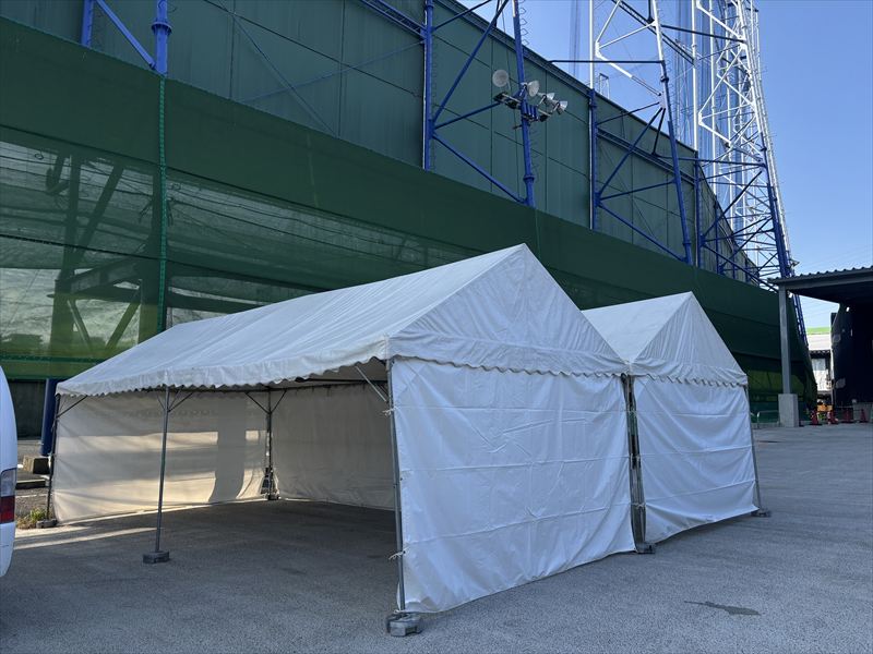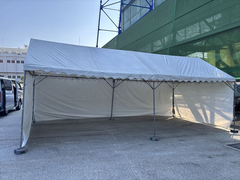 組み立て式テントとなっております。屋外で雨の日も暑い日もテントがあると色々な環境から守って貰えます。6坪の大きさがあるので広々と使えますし、動線も取りやすいです。テントを強風から守る為にウェイトを一緒にご利用することをオススメしております。