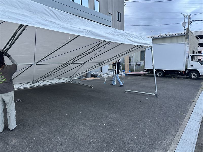 A設営や撤去にかかる時間は、当日の現場状況や天候、作業人数によって前後する場合もございますが、弊社のベテランスタッフが対応する場合、3×4間サイズのステージテントであれば、設営・撤去ともにそれぞれ約1時間程度で完了いたします!