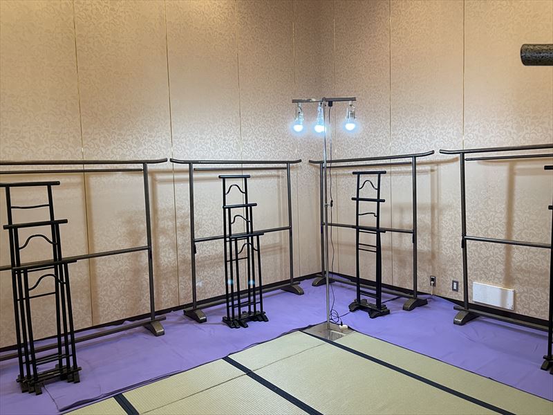 例えば、畳や衣桁、撞木、毛氈といった和のアイテムを取り入れた「呉服展示」では、伝統美を引き立てつつ、来場者の方々に見やすく、落ち着いた中にも華やかさを感じられる空間を演出しています!古き良き和の雰囲気を大切にしながらも、現代の展示スタイルにマッチさせる工夫を行っております!