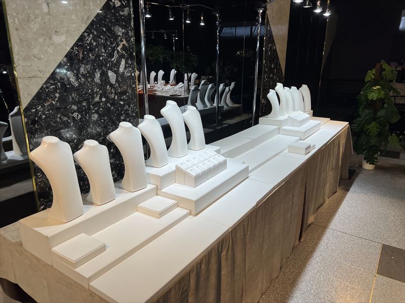 また、宝飾展示では、宝飾ステージやディスプレイ、ライトを効果的に組み合わせることで、商品の魅力を最大限に引き出す演出を実現!宝石やジュエリーがキラキラと輝き、思わず足を止めたくなるような空間をご提供しています!光の当て方ひとつにもこだわり、より一層商品の価値が伝わる展示を目指しています!