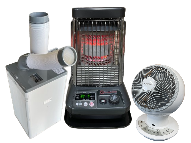 トップスプランでは、寒い季節に活躍するストーブ、ブルーヒーター、暑い季節に活躍する、スポットクーラー、気化式冷風機などの 様々な冷暖房機器を取り扱っています! 家庭用のものから大型のものまであり、使用する場所や広さによって商品をお選びいただけます。 イベント会場の控室に設置したり、ご家庭でご利用いただいてます!