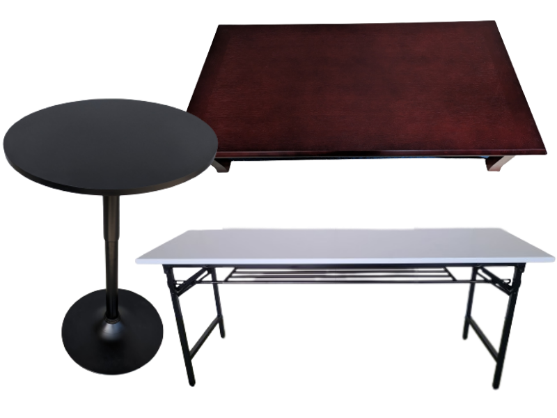 トップスプランでは、色々なテーブルがあり、シンプルな会議用テーブルから丸い形の丸テーブルやおしゃれなデザインのテーブルなど多種多様にございますので会場に合わせて商品をお選び下さい! 在庫も数多くございますので、たくさんのご利用も可能となっています!YouTubeなどでサイズや特徴の説明などをしている商品もございます!